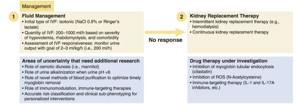 O uso de manitol não é recomendado rotineiramente devido ao risco de hipovolemia. Em teoria, o uso de diuréticos osmóticos, como manitol, pode reduzir o edema muscular e assim causar uma menor liberação de mioglobina