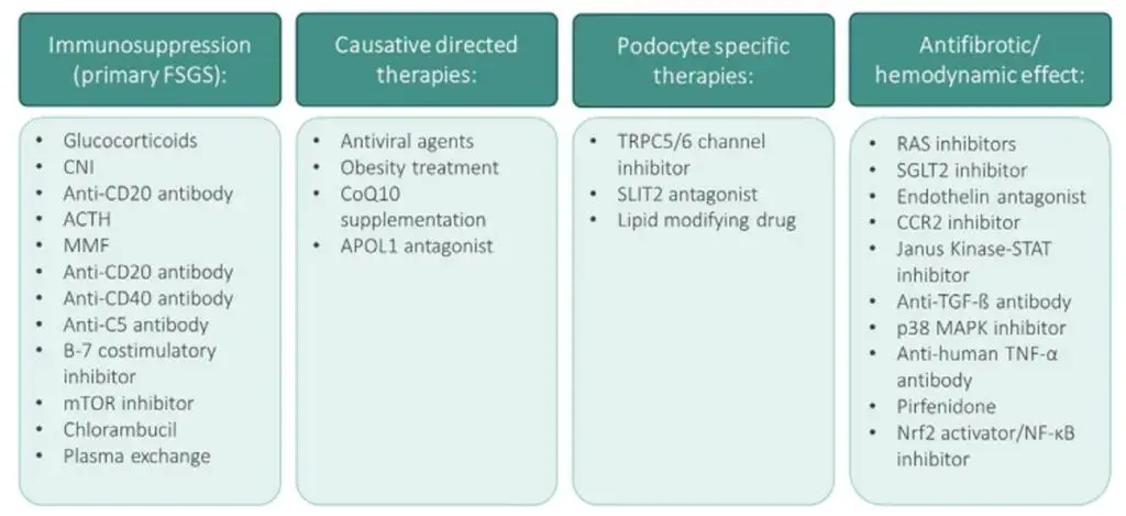 No entanto, recentemente houve um aumento notável em terapias emergentes visando cascatas de sinalização patogênicas definidas. Um resumo de ensaios clínicos recentes e em andamento para GESF são fornecidos na Tabela 1 assim como a data até o final do estudo.